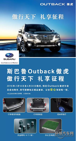 1.2016年2月14日至4月30日,預定Outback傲虎車型且成功購車,即可獲贈斯巴魯純正精品套裝。傲虎安全之道,守護您的每一次果敢出發,穩前行,直至平安抵達