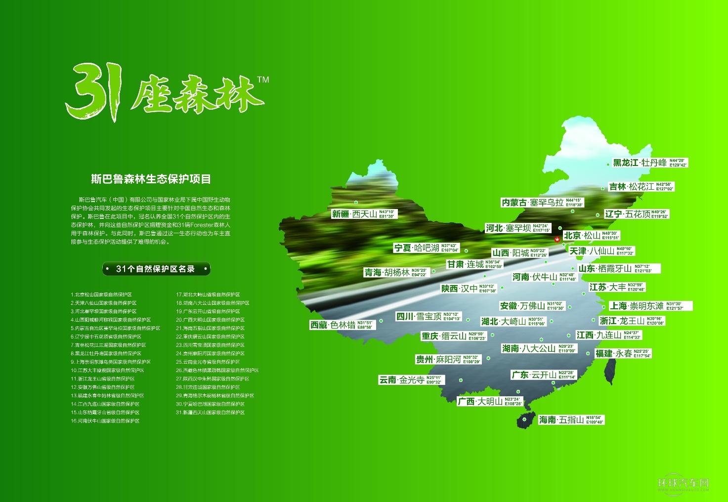 斯巴魯一直積極關注和支持中國的自然生態保護事業,為此在2012年底與國家林業局下屬中國野生動物保護協會共同發起了“斯巴魯森林生態保護項目”,并通過這個項目在中國31個自然保護區內冠名認養了生態保護林,向這些自然保護區捐贈資金和31輛Forester森林人用于森林保護。