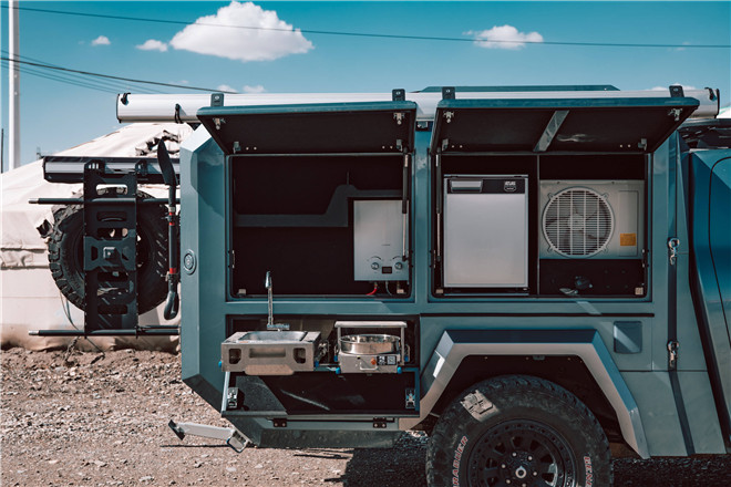 車輛還配備車載式冰箱、出拉式爐灶、組合式洗漱水槽和100L水箱,可隨時化身荒野廚房,烹制一頓美味的露營餐。車廂配備側邊帳,車身兩側空間還設置專用儲物格。在心儀的景色邊停車,在側邊帳下擺上桌椅,一邊欣賞如詩如畫的風景,一邊看看書、聊聊天或者品一杯手沖咖啡,享受愜意休閑的時光。