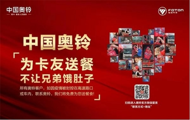 最近,各地疫情頻發,奧鈴踐行企業社會責任,多次捐助物資、提供車輛保障。3月28日,中國奧鈴山東聊城經銷商組織運送生活防疫物品前往各地村委會;4月2日,海南政府調撥物資緊急馳援上海,中國奧鈴為順豐運送車隊提供車輛護衛及全程免費車輛服務保障。此外,中國奧鈴還發起了“以愛戰疫”行動倡議書,向因疫情被封控在高速路口或車內的奧鈴卡友免費送出數百份“愛心餐”,并呼吁各界社會優秀力量關注卡友,幫助卡友,同心抗疫,打通物流運輸阻力,助力疫情防控地區物資保障。