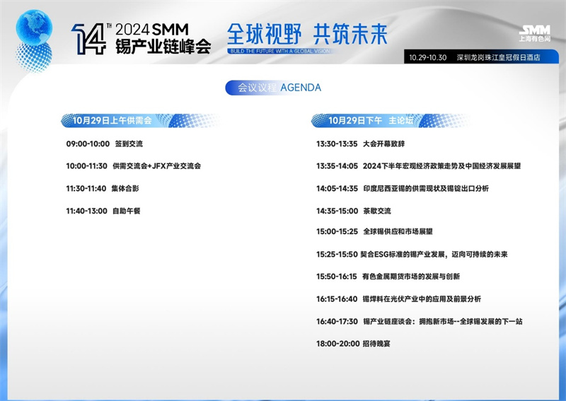 “2024SMM(第十四屆)錫產業鏈峰會”將于2024年10月29日-10月30日在深圳隆重舉辦。