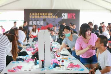 早上7點,感染者玩家們便早早進了化妝區(qū)域,開始為接下來的5公里生死競速做準備。為了讓游戲效果更加逼真,主辦方請到了國外求生之旅的專業(yè)特效化妝團隊親臨現(xiàn)場,與上海溫哥華電影學院的化妝師們通力合作,為玩家的“變身”做足了準備。玩家無論是想做燒傷鬼、刀砍鬼,還是來自日本的鬼娃花子,悉數(shù)都可選擇。