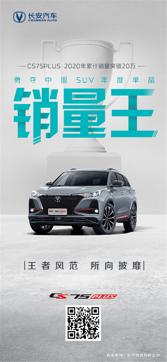 就在長安CS75PLUS以“吾輩 敢當(dāng)”的魄力為用戶帶來科技時代的汽車生活體驗時,CS75PLUS的“明日智能”更得到了行業(yè)內(nèi)外的一致褒獎。2019年,長安CS75PLUS在該年度i-vista中國智能汽車指數(shù)測評結(jié)果中獲得第一,并成為了2019年智能汽車指數(shù)推薦車型。2020年,CS75PLUS更榮膺中央廣播電視總臺2020中國汽車風(fēng)云盛典“最佳智能網(wǎng)聯(lián)汽車”獎項。而掀起了“明日潮流”的CS75PLUS,在這一年更是以單車型銷量突破20萬輛的市場表現(xiàn),登頂年度中國SUV單品銷量王!