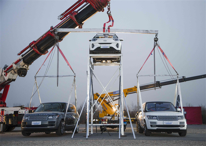 此次挑戰的是2臺重量均為2.5噸的路虎攬勝行政版,將奇瑞小螞蟻放置杠桿中間,使之形成“天平”效果,兩側力臂長度各3米,再加上兩側新增加的拉桿和導輪等附件,杠桿整體重量為0.25噸。兩側重量一致,不受“角速度”等變量影響,所以這次作為支點的奇瑞小螞蟻承重的重力則5噸(2臺路虎攬勝行政版)+0.25(杠桿重量),即需要面對5.25噸的壓頂挑戰。在這種雙重重壓下,奇瑞小螞蟻卻依舊穩穩撐起了2臺路虎攬勝行政版,其全鋁車身也堅固如初。