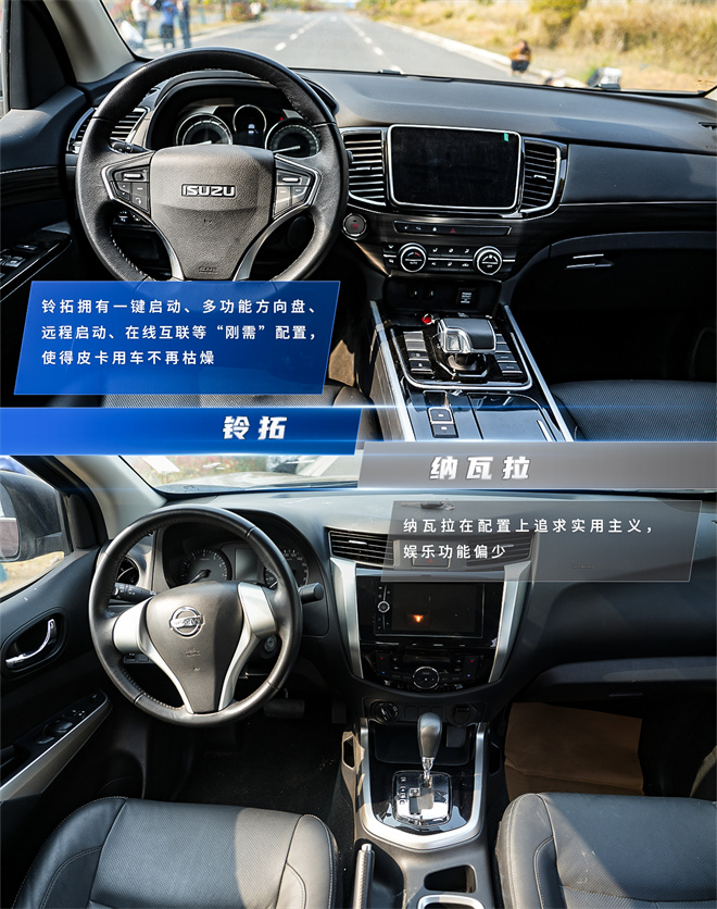 而反觀納瓦拉,在配置上則追求實用主義,多數位置采用了硬質塑料,娛樂功能也偏少,不過該有的安全配置也一個沒落下,更符合一些商業用車場景。