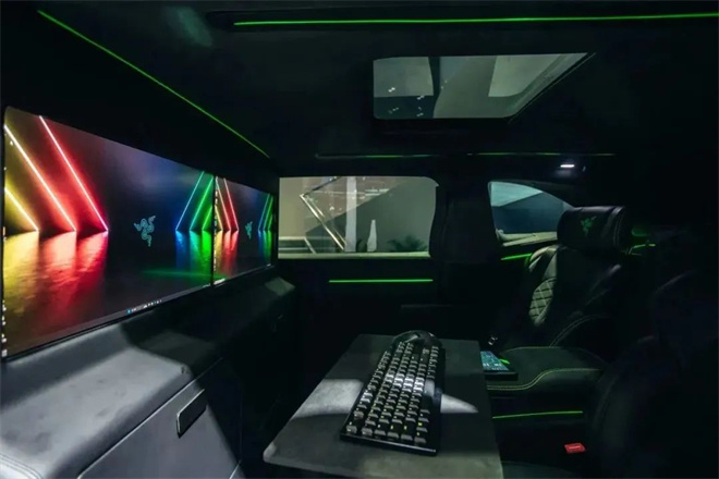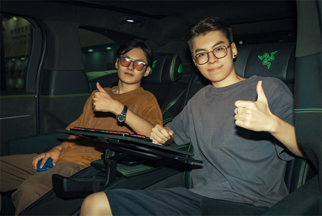 這種電競風格不僅外顯于形,還延續到了車內。其采用雷蛇全家桶旗艦設備,在硬件系統、座椅舒適度和座艙氛圍等各方面都做到了“滿配”,包括超強的靈刃游戲筆記本電腦、雷蛇獨創的Chroma幻彩燈光系統、THX空間音效以及多種外設支持等等,打造出沉浸式電競氛圍艙。它仿佛將游戲中的車直接開到了現實中,讓玩家們隨時隨地都能任性開黑。