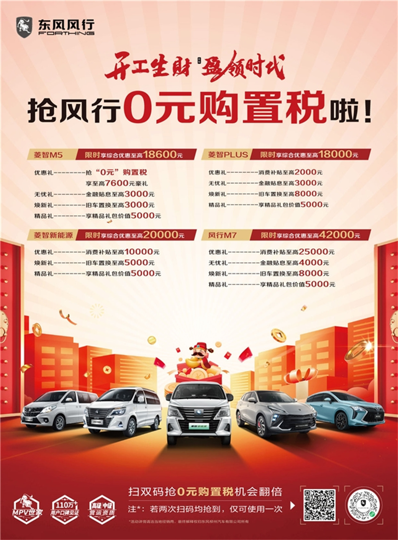 除了眾車型大額的購車優惠外,菱智家族的“開工生財,盈領時代”活動還有更多福利。大家只需在風行APP或風行公眾號內,找到風行0元購置稅活動界面,掃碼進入H5參與抽獎,輕松獲得驚喜開工紅包或菱智專享購置稅抵扣券。其中開工紅包中獎即可領取;而購置稅抵扣券分為全免和半價兩種類型,可用于購置菱智M5、菱智V3。抽中抵扣券后會獲得專屬券碼,只需在20天內聯系所屬地區東風風行經銷商,購車后出示專屬券碼即可抵扣相應購置稅。