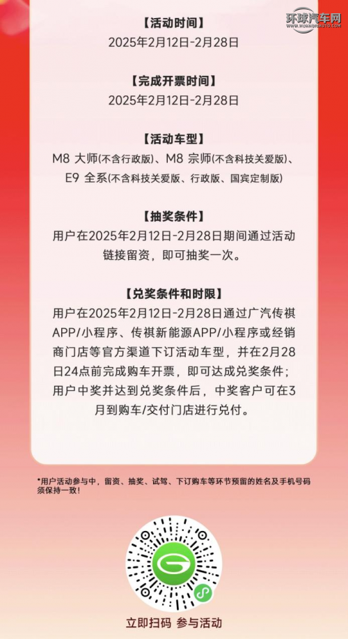 用戶在2025年2月12日-2月28日通過廣汽傳祺APP/小程序、傳祺新能源APP/小程序或經銷商門店等官方渠道下訂M8大師(不含行政版)、M8宗師(不含科技關愛版)、E9 (不含科技關愛版、行政版、國賓定制版)即可參與抽獎,有機會免費獲取17.3吋觸屏吸頂電視和丹拿定制音響,實現(xiàn)車內的頂級視聽體驗。中獎的用戶僅需在2月內完成購車開票便達成兌獎條件。