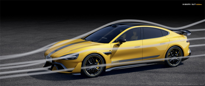 小米SU7 Ultra的設計圍繞巔峰性能展開,新增的設計服務于功能性,沒有多余的裝飾。外觀設計方面,在小米SU7 Max的基礎上,小米SU7 Ultra加入了空氣動力學套件,車身尺寸進一步加大,長、寬、高、軸距分別為5115mm、1970mm、1465mm、3000mm,車身更修長、更低趴,姿態更戰斗。小米SU7 Ultra車頭加入超大尺寸前鏟和氣壩,搭配U型風刀,有效增加車輛前部下壓力。進氣格柵開口進一步加大,散熱面積增大10%。尾部新增主動尾部擴散器,兩擋自適應調節,兼顧風阻與下壓力,日常行駛低能耗;同時新增碳纖維固定式大尾翼,尾翼翼展達到1560mm,弦長240mm,高速行駛時帶來可觀的下壓力。得益于全新的空氣動力學設計,小米SU7 Ultra最大下壓力可達285kg,媲美超跑級別車型。