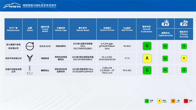 本次發布的IVISTA網聯智能與隱私安全專項測評2025年第一批次結果涵蓋了沃爾沃EX30、嵐圖知音、魏牌藍山三款車型。其中,沃爾沃EX30及魏牌藍山網絡與隱私安全整體評價獲得G評級,嵐圖知音獲得A評級。