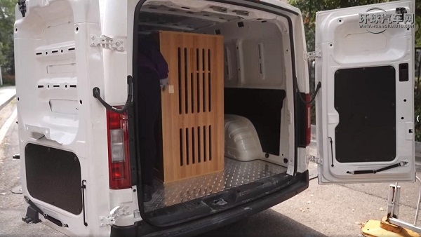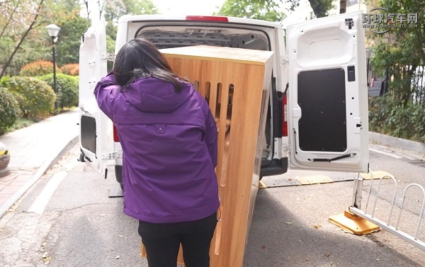 第二單貨有點“奇葩”,是個養(yǎng)貓用的小木屋,也稱“貓別墅”(城區(qū)工況)。這物件重量不大但是體積較大,高度達到一米二。前面開小面的師傅都因為裝不下把訂單取消了,貨主有心忍痛叫個4米2的廂貨,但又覺得不值。得益于一體化承載車身的低地板設計,樂福的貨艙內部凈高度達到了一米四五,而離地間隙并沒有受到影響,侯女生輕松接下了這單。
