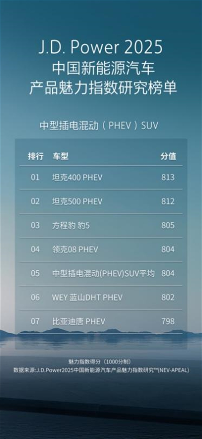 近日,在J.D.Power君迪最新發布的《2025中國新能源汽車產品魅力指數研究SM(NEV-APEAL)》中,坦克400 Hi4-T摘得中型插電混動(PHEV)SUV細分市場桂冠。這一獎項不僅是對坦克400 Hi4-T兼具硬核性能與綜合魅力的認可,更標志著硬派越野車在新能源時代的價值破圈。