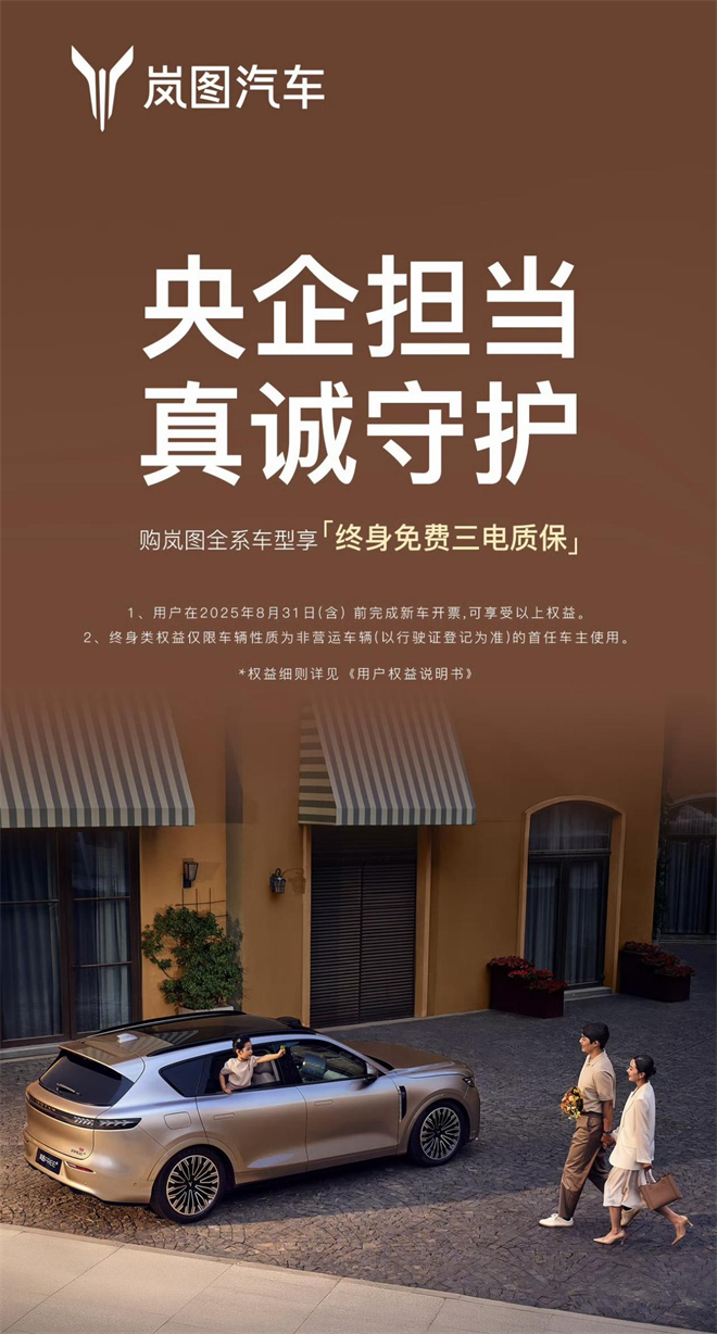 面對用戶對三電系統長期保障的關切,嵐圖展現出高效的“聽勸”姿態。在FREE+上市引發強烈反響后,嵐圖官方迅速宣布,為全系車型提供終身免費三電系統質保。這一重大權益升級,直擊用戶對長期用車安心的核心訴求,也彰顯了嵐圖作為“國家隊”的擔當與對自身產品品質的絕對信心。