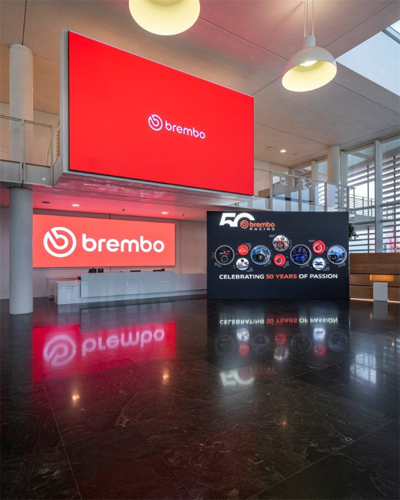 (布雷博全球總部的"慶祝50年激情之路"主題展墻)