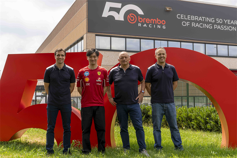 半世紀技術傳承,鑄就賽道輝煌 在布雷博執行董事長Matteo Tiraboschi(馬泰奧·蒂拉博斯齊)、名譽主席Alberto Bombassei(阿爾貝托·邦巴塞)、首席執行官Daniele Schillaci(丹尼爾·舒拉奇)等高層陪同下,由車隊領隊Frédéric Vasseur(弗雷德里克·瓦塞爾)、副領隊Jerome D’Ambrosio(杰羅姆·德安布羅西奧)、體育總監Diego Ioverno(迭戈·約弗諾)以及儲備車手周冠宇組成的法拉利HP車隊代表團參觀了位于"千米紅墻"科技園區的布雷博總部大樓。作為中國首位F1車手,周冠宇的參與為此次訪問增添了特殊意義。