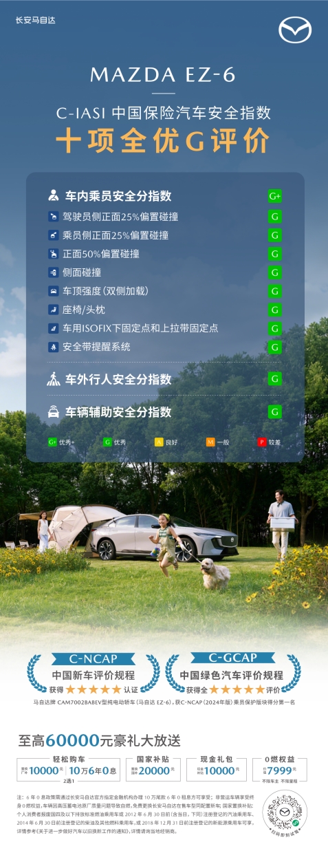 7月29日,長安馬自達(dá)MAZDA EZ-6(以下稱EZ-6)在安全領(lǐng)域再傳捷報(bào)。繼榮獲2025 年C-NCAP五星安全評級以及行業(yè)首個(gè)“貨車橫向夾擊疊加托底挑戰(zhàn)”001號安全證書后,EZ-6在2025中保研C-IASI測評中,再次強(qiáng)勢斬獲“車內(nèi)乘員安全指數(shù)”、“車外行人安全指數(shù)”、“車輛輔助安全指數(shù)”三大板塊10項(xiàng)G優(yōu)秀評價(jià),成為合資新能源首款實(shí)現(xiàn)安全領(lǐng)域三連冠的B級轎車。此前次世代MAZDA3昂克賽拉、MAZDA CX-30、MAZDA CX-50行也均已在中保研測評中榮膺6項(xiàng)G優(yōu)秀評價(jià),共同構(gòu)成長安馬自達(dá)“全系安全全優(yōu)”的品牌基因圖譜。