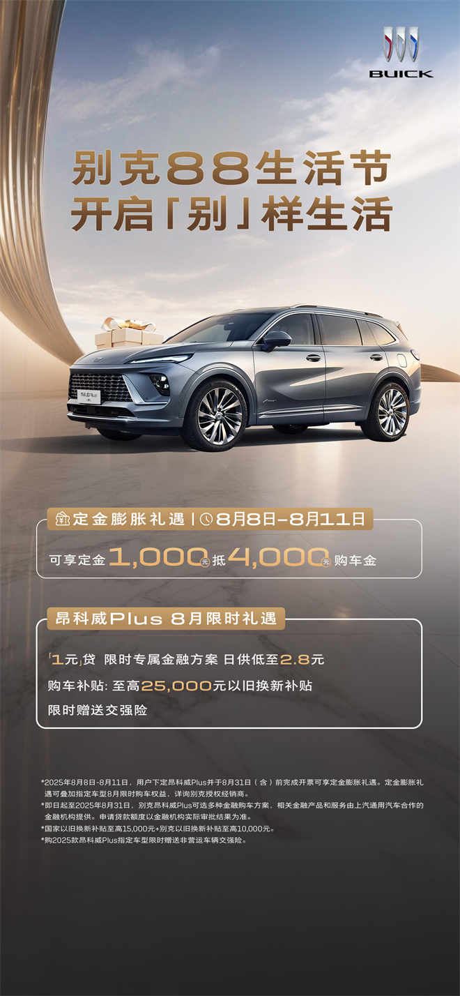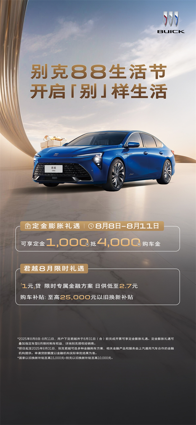 2025年8月8日 金秋漸近,別克品牌盛大開啟“88生活節(jié)”限時(shí)購車禮遇:8月8日至8月11日期間,用戶下定昂科威Plus、君越等車型,即可享受1000元定金抵4000元購車金。值得一提的是,本次定金膨脹禮遇可在“一口價(jià)”基礎(chǔ)上,疊加“1元貸”金融方案以及至高25000元置換補(bǔ)貼等多重優(yōu)惠。這也是今年以來別克推出的力度最大的活動(dòng),助力用戶輕松開啟“別”樣生活。
