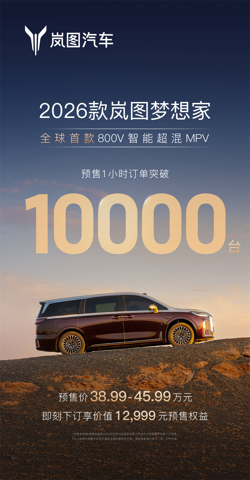 預售一小時破萬訂單,不是偶然,而是用戶對“真技術、真體驗”的投票。當合資MPV還在靠品牌溢價時,2026款嵐圖夢想家用8大首發黑科技,證明了中國高端MPV不僅能追,更能引領。這不僅是夢想家的勝利,更是屬于“智能超混新時代”的開端。