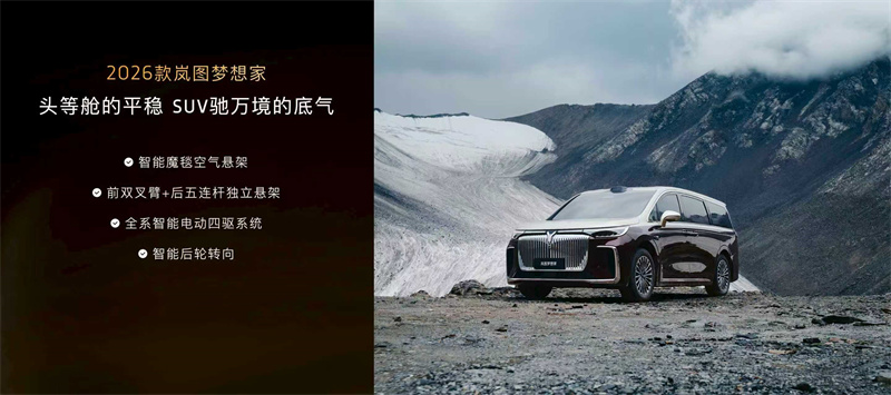 2026款嵐圖夢想家推出智能超混版和智能純電版,預售價38.99萬元起,最高45.99萬元,誠意十足。預售期間更推出總價值超萬元的權益:2000元抵5000元尾款、終身免費三電質保、終身免費基礎保養、優先交付提車,真正讓用戶買得值、用得省。