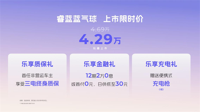 睿藍藍氣球不僅以4.29萬的親民價格入市,還推出多重購車禮遇,徹底減輕年輕用戶的擁車壓力。首任非營運車主享受三電終身質保,提供12期2萬0息或首付0元金融方案,日供低至30元,還贈送1把便攜式充電槍。