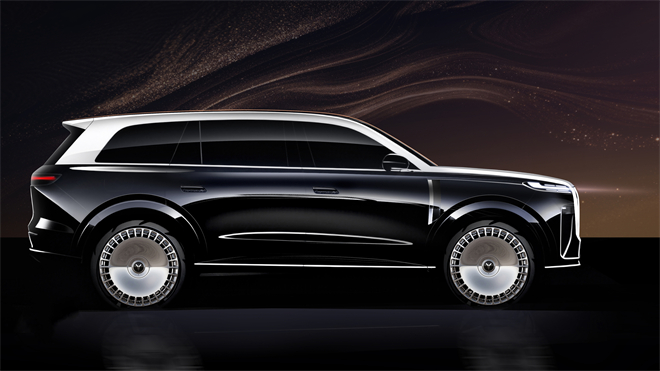 側面手稿則進一步展現了 “極” 的魅力,流暢的腰線從車頭延伸至車尾,如同山巒起伏的輪廓,既勾勒出車身的修長線條,又賦予了車輛強烈的力量感。前輪眉至前門的距離、車頂至車身底部的高度比例,都經過精心調配,使得整車在視覺上更顯沉穩大氣,宛如一件移動的藝術品。