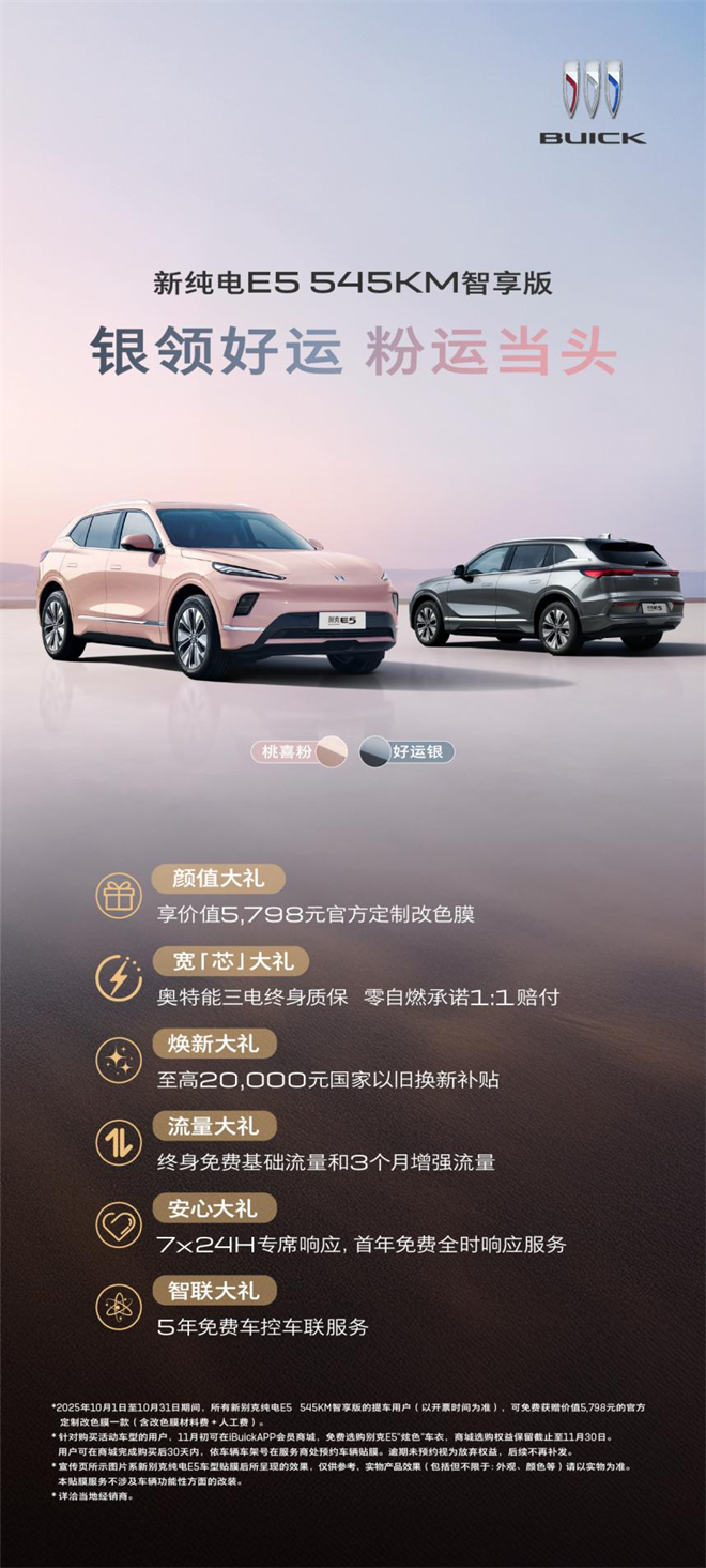 2025年9月30日 正值國慶、中秋雙節來臨,別克品牌推出購車重磅福利:購買別克純電E5先享版,可在14.99萬元一口價基礎上,疊加至高“15 倍超級膨脹金”限時福利——1,000元定金抵扣15,000元,實際入手價低至13.59萬元,讓消費者用緊湊型純電車的預算就能擁有中大型SUV越級體驗;同時選購別克純電E5智享版,可限時免費獲贈售價5,798元的“好運銀”或“桃喜粉”限量版炫色車衣,兼顧個性化審美與美好寓意*。此外,所有版本均享受奧特能三電系統終身質保、零自燃承諾1:1賠付、5年免費車控車聯服務等安心保障,還可疊加至高2萬元置換補貼。別克純電E5真正從用戶核心需求出發,以實打實的權益降低購車與用車成本,為消費者提供高品質純電出行解決方案。