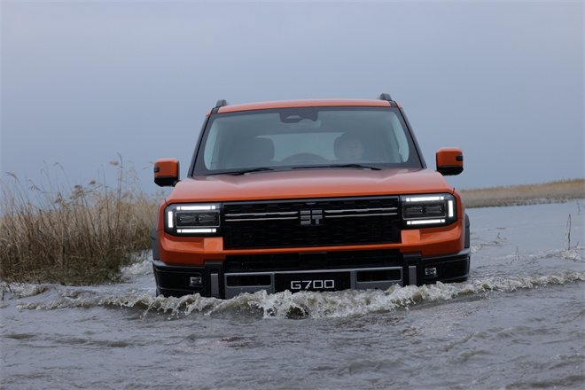涉水環節更顯硬核。當G700駛入600mm深的模擬河道,IP68級防水的發動機、電池與電機全程穩定輸出,行業首創制動盤清潔功能自動激活,出水后制動力無絲毫衰減。從容的涉水表現,源自G700防水技術的突破性進階,其首搭的2.0TD混動專用發動機通過五大防水技術升級,達到同級別第一的IP68級防水,在水中浸泡2小時后仍然可以正常啟動,是國標要求浸水30分鐘時長的四倍;整車涉水能力在空懸狀態下達到970mm,達到路虎攬勝(涉水深度900mm)、路虎衛士OCTA(涉水深度1000mm)等百萬豪車水平。