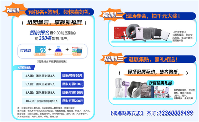 預(yù)報(bào)名+會(huì)議當(dāng)天9點(diǎn)半前現(xiàn)場(chǎng)簽到的前300名整機(jī)用戶,可享加贈(zèng)50元京東卡、免費(fèi)午餐以及專業(yè)期刊的福利。組團(tuán)參會(huì),福利加倍!3人團(tuán),團(tuán)隊(duì)簽到滿3人,團(tuán)長(zhǎng)可得50元;10人團(tuán)簽到滿10人,團(tuán)長(zhǎng)可得200元。