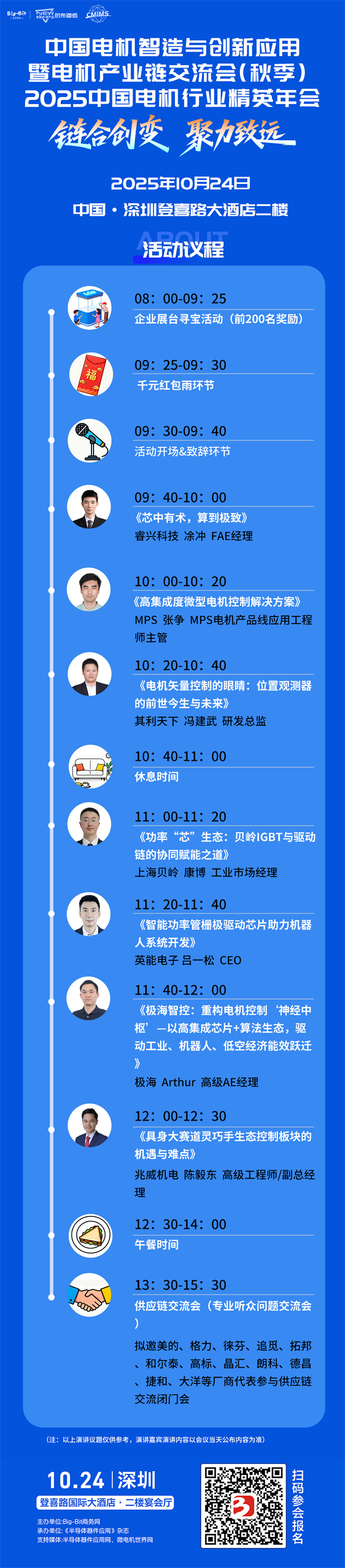 為聚焦技術(shù)前沿、促進(jìn)行業(yè)共同發(fā)展,由Big-Bit商務(wù)網(wǎng)主辦、《半導(dǎo)體器件應(yīng)用》雜志承辦的“中國(guó)電機(jī)智造與創(chuàng)新應(yīng)用暨電機(jī)產(chǎn)業(yè)鏈交流會(huì)(秋季)”將于10月24日在深圳盛大開幕。