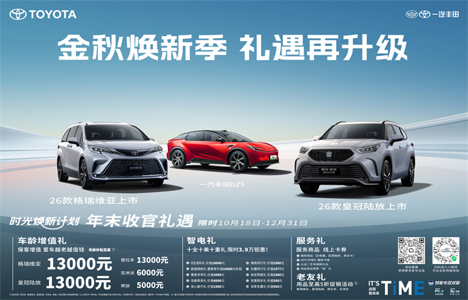 不止如此,為回饋用戶厚愛,一汽豐田金秋煥新季,禮遇再升級。10月18日至12月31日,皇冠陸放、格瑞維亞、普拉多等重磅車型不僅可享至高1.3萬元的車齡增值禮;同時還有智電禮、服務禮和用品至高5折的好友禮等多重大禮,以極致誠意為用戶創造最佳購車時機。