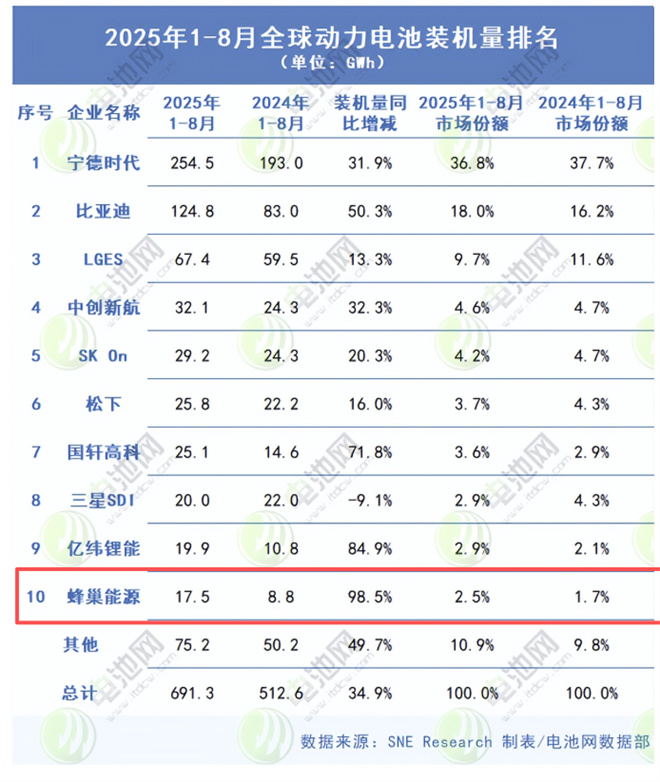 根據(jù)韓國(guó)研究機(jī)構(gòu)SNE Research最新數(shù)據(jù),2025年1-8月,蜂巢能源海外動(dòng)力電池裝車(chē)量達(dá)5.4GWh,同比大幅增長(zhǎng)593.4%,增速高居全球主流電池企業(yè)榜首,并躋身海外市場(chǎng)裝車(chē)量排名前十。與此同時(shí),其全球總裝機(jī)量達(dá)17.5GWh,同比增長(zhǎng)98.5%,成功進(jìn)入全球動(dòng)力電池裝機(jī)量前十陣營(yíng),成為增長(zhǎng)最快的行業(yè)“黑馬”。