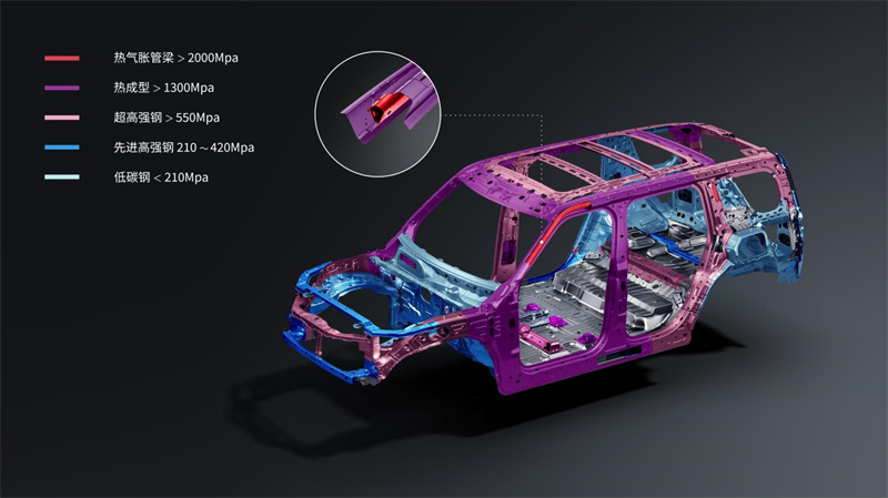 全維防碰撞系統CAS 4.0支持4-150km/h全時速剎停避障,遇到行人橫穿、鄰車加塞等突發情況時,系統會自動緊急制動,提前規避風險。83.2%占比的高強度鋼、結構總長度達到12.48m的2000MPa熱成型材料、2000MPa A柱內嵌熱氣脹管梁結構設計等,能在碰撞時最大程度保護座艙完整,給家人實打實的硬核防護。