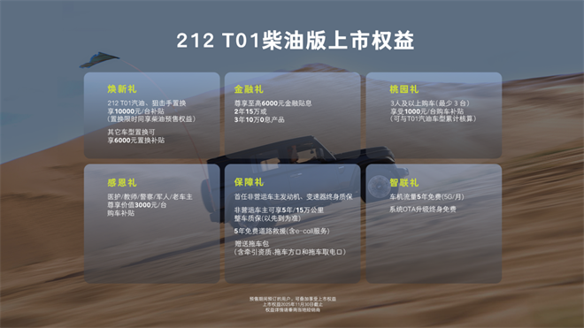 千公里穿越的從容應對,源于212 T01柴油版的硬核產品力;而長久馳騁的安心保障,則來自品牌對越野愛好者的深度考量。從組隊穿越的默契協作,到老車主升級座駕的需求,從長途探險的售后顧慮,到日常用車的智能體驗,212以六大上市專屬權益,覆蓋購車、用車、養車全場景,讓每一份探索熱情都能得到全方位支撐。尤其是煥新禮與保障禮,前者為老車主及置換用戶提供專屬支持,讓升級座駕、延續越野情懷更輕松;后者則針對復雜路況量身打造,以長效質保與免費救援服務,為長途穿越、無人區探險等旅程筑牢安心防線,讓“說走就走的越野”不止于口號。