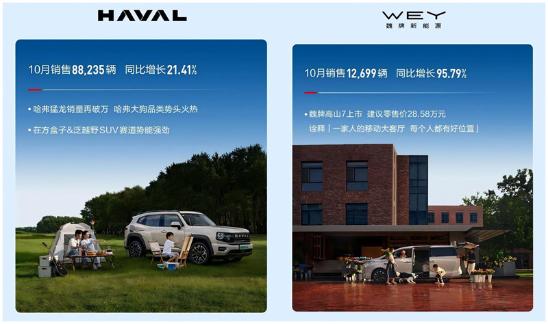 全球化布局再提速,10月海外交付量達57,158輛,同比增長28.68%,1-10月累計海外銷量已達391,339輛,海外市場成為重要增長極。個性化品類優勢穩固,“方盒子”車型銷售65,942輛,同比增長23.06%,在泛越野與硬派風格細分市場形成獨特競爭力。