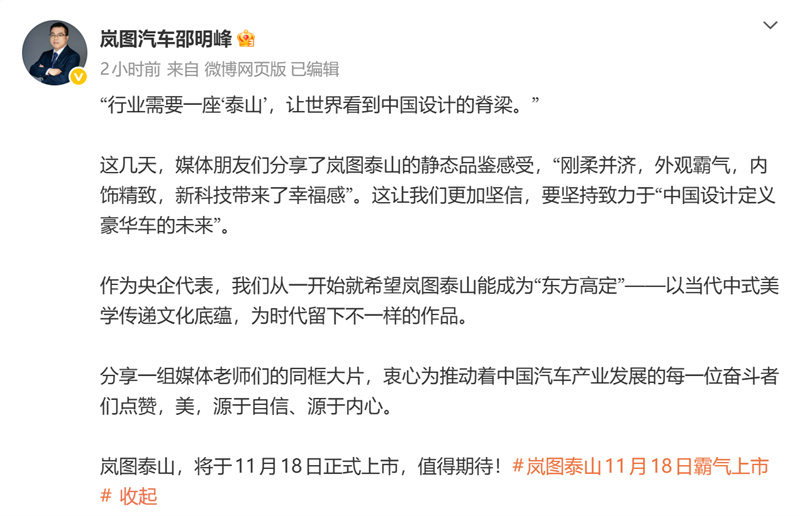 近日,嵐圖汽車CBO、銷售公司總經(jīng)理邵明峰,在社交平臺公布嵐圖泰山正式上市時間,并分享了該車的設(shè)計思考——劍指成為“東方高定”,以當(dāng)代中式美學(xué)傳遞文化底蘊,為時代留下不一樣的作品,讓中國設(shè)計定義豪華車的未來 。據(jù)悉,這款備受矚目的新時代旗艦SUV將于11月18日正式上市。
