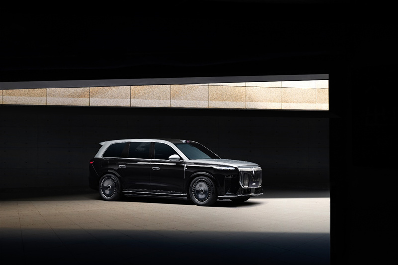 而令其在發(fā)運(yùn)途中便自成焦點(diǎn)的,則是其磅礴氣韻與東方美學(xué)設(shè)計(jì)。車身超5.2米、寬超2米,呈現(xiàn)出“山海萬壑”般的磅礴體態(tài)。前臉34根光瀑華柱格柵與“天地之鏡”輪轂,靜止時(shí)如收納蒼穹,行進(jìn)時(shí)盡顯王者姿態(tài)。細(xì)節(jié)處,“日月同輝”大燈、“山海倒影”尾燈,以及門把手上的“流光星辰”點(diǎn)陣,皆在方寸間植入東方意象,向世界宣告:中式豪華,自有其道。