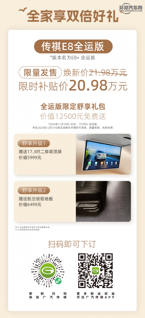 值上市兩周年之際推出的E8全運(yùn)版,更是在原有優(yōu)勢基礎(chǔ)上做了加法,新增價值超 12500 元的滿配升級,17.3 吋二排吸頂屏讓后排乘客不管是看全運(yùn)賽事回放還是追劇,都能擁有沉浸式體驗;航空級鋁地板套裝不僅顏值高,還耐磨易清潔,帶娃出行再也不怕弄臟車廂。在20萬級家用MPV市場,能做到這樣的配置升級,傳祺簡直是 “卷王本王”。