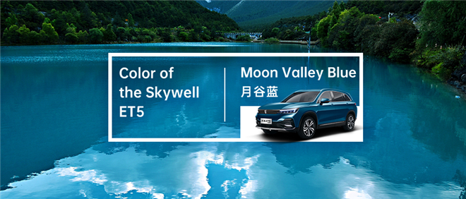 27.13°N,100.25°E,海拔3100m,玉龍雪山藍月谷。玉龍雪山中含有硫酸銅,融水變藍流到山谷湖中。在燦爛陽光的照耀下,清澈的湖面如藍寶石般在閃爍著光芒。天美設計師在此迸發靈感,調取湖水的顏色融入天美ET5車身上,由此取名——月谷藍。
