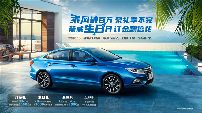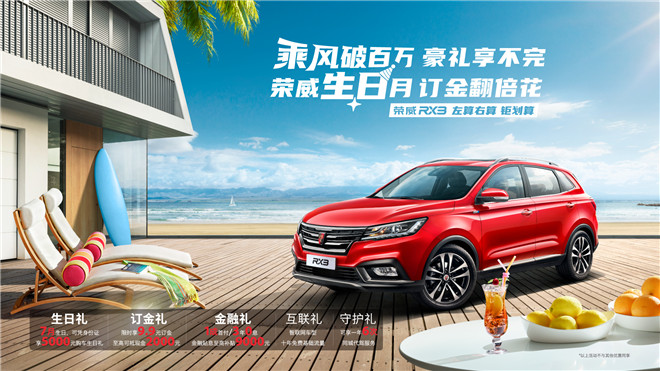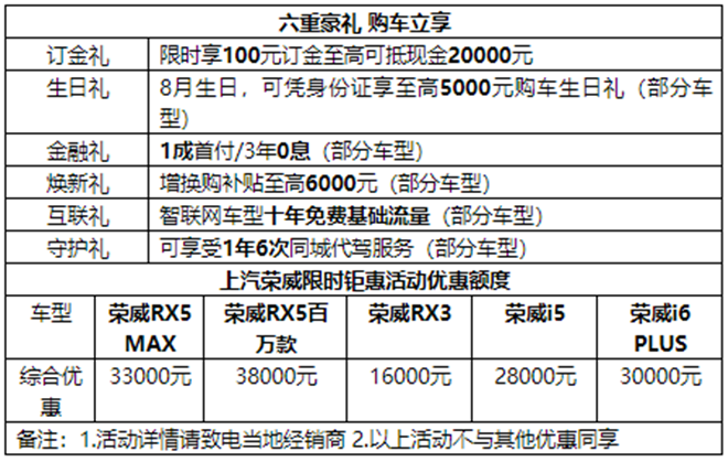 為慶?;ヂ摼W汽車銷量突破百萬大關,上汽榮威在“榮威寵你 月月有禮”用戶關懷計劃之后,再次加碼推出“乘風破百萬 豪禮享不完 榮威生日月 訂金翻倍花”的限時大促活動。即日起至8月31日,凡是8月生日的用戶(包括購車人親朋好友),購買榮威RX5 MAX、榮威RX5百萬款、榮威RX3、榮威i5、榮威i6 PLUS等任一款產品,均可享受巨額綜合優惠。實惠和福利參見下表: